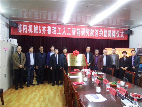 2019年4月21日上午,在市科技局曹文利局长、市环保局闫锡升主任的见证下,博阳机械与齐鲁理工学院在安丘博阳机械制造有限公司举行博阳机械&齐鲁理工人工智能研究院签约暨揭牌仪式,决定聘王佐勋教授为研究院院长、闫吉祥总经理为副院长、雷腾飞教授为副院长、袁东风教授为总顾问,并聘任齐鲁理工学院李春彪教授、刘恩超教授、黄明键教授、李国平教授、赵方教授、刘圣田教授、葛荣雨副教授、雷腾飞副教授、付海燕副教授、厉相宝副教授、苏敏副教授、王艳玲副教授、刘娜副教授,环保局闫锡升高级工程师、博阳机械孙红金副总经理、岳献宝副总经理、刘洪亮经理、山东伟豪思智能仓储装备郭伟总经理为技术专家。