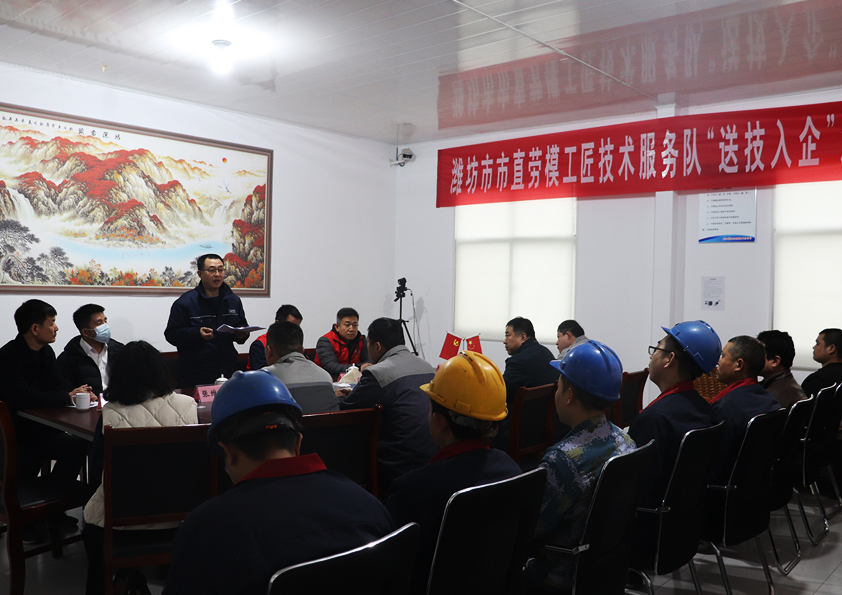 2021年12月9日上午,潍坊市市直劳模工匠技术服务队“送技入企”活动--安丘专场在安丘博阳机械会议室举行,潍坊市工人文化宫技术创新科科长张维德出席活动并讲话。安丘市总工会李仕德主任,海化集团工程师刘国鸿、李树基,安丘博阳机械总经理闫吉祥、副总李文明等相关领导出席活动。博阳机械闫总经理对各位领导的到来表示热烈欢迎。
